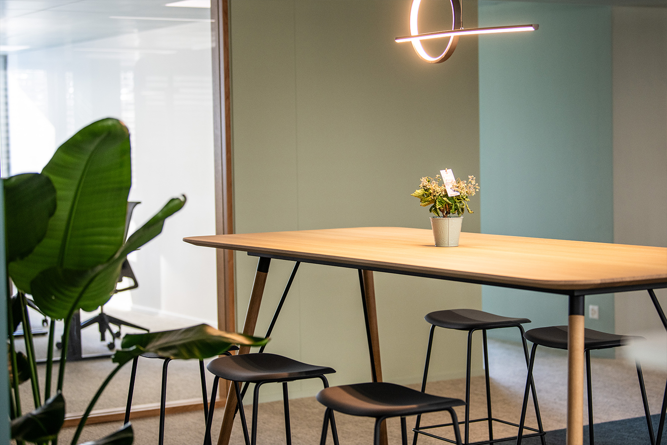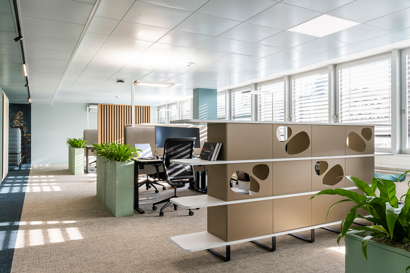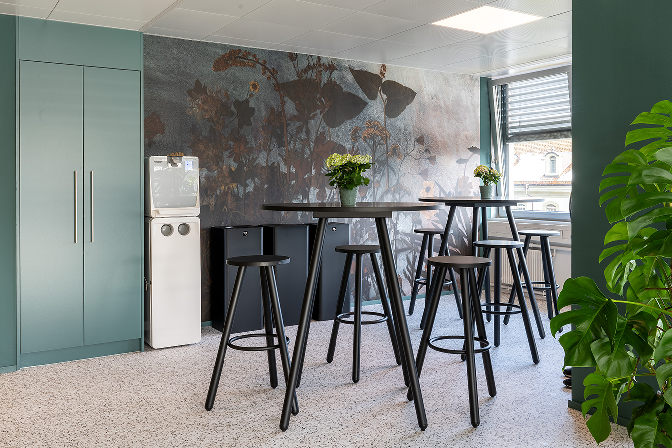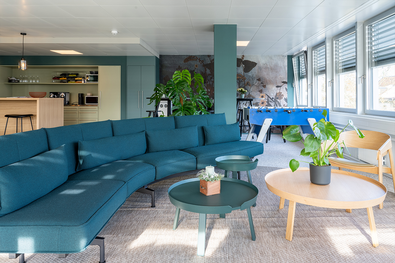 Die diversen Aufenthaltsflächen sind mit Tischen und Stühlen in Stahl-Holz-Optik bestückt. Sie betonen die farblich von der Natur inspirierte und moderne Bürolandschaft zusätzlich. Für den besonderen Wohlfühlcharakter sorgen zahlreiche Grünpflanzen und der neu gestaltete Pausenraum, der mit grossem, komfortablem Sofa behaglich anmutet.