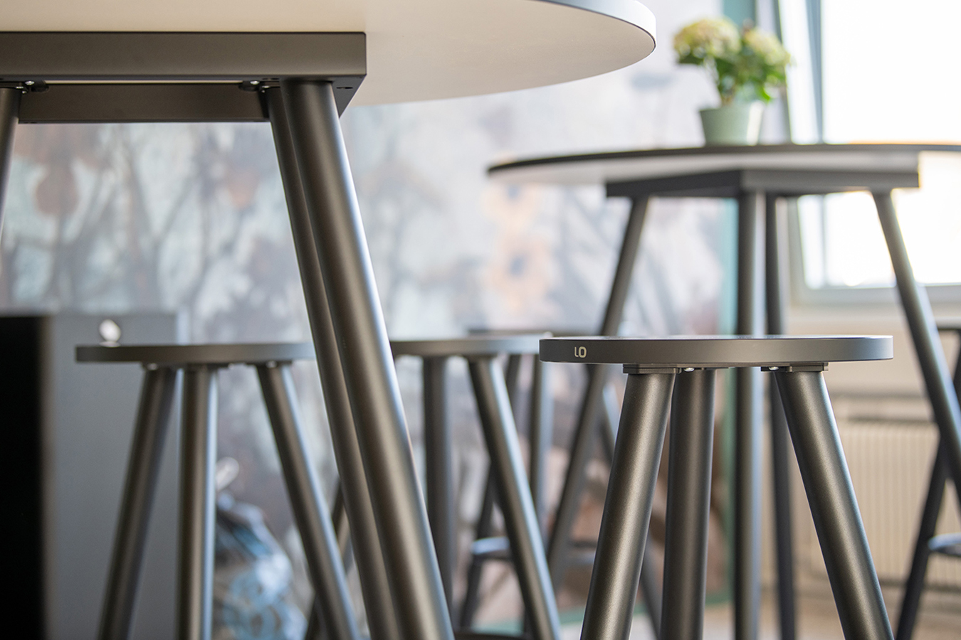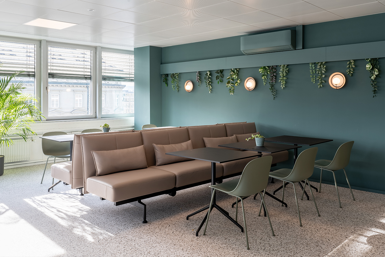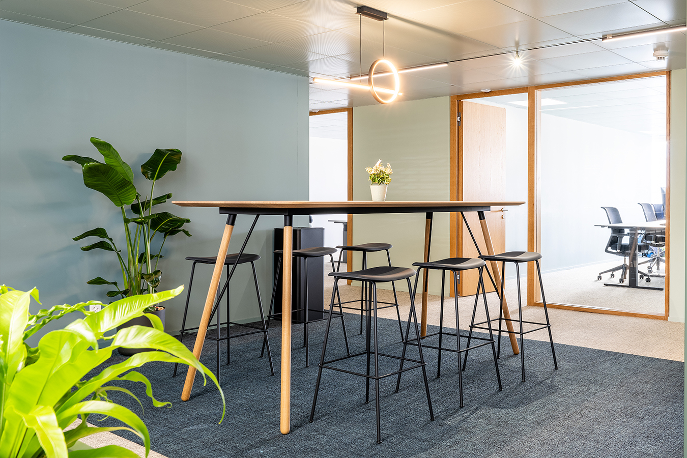 Die diversen Aufenthaltsflächen sind mit Tischen und Stühlen in Stahl-Holz-Optik bestückt. Sie betonen die farblich von der Natur inspirierte und moderne Bürolandschaft zusätzlich. Für den besonderen Wohlfühlcharakter sorgen zahlreiche Grünpflanzen und der neu gestaltete Pausenraum, der mit grossem, komfortablem Sofa behaglich anmutet.