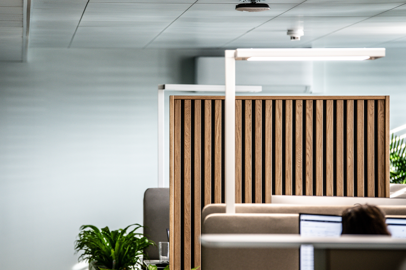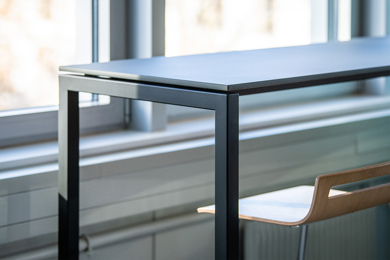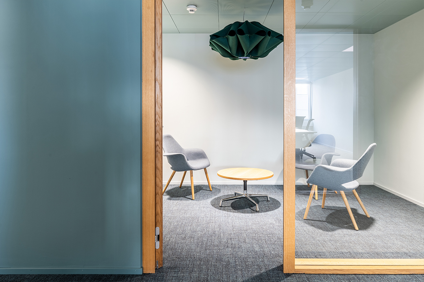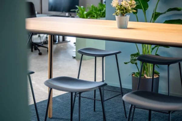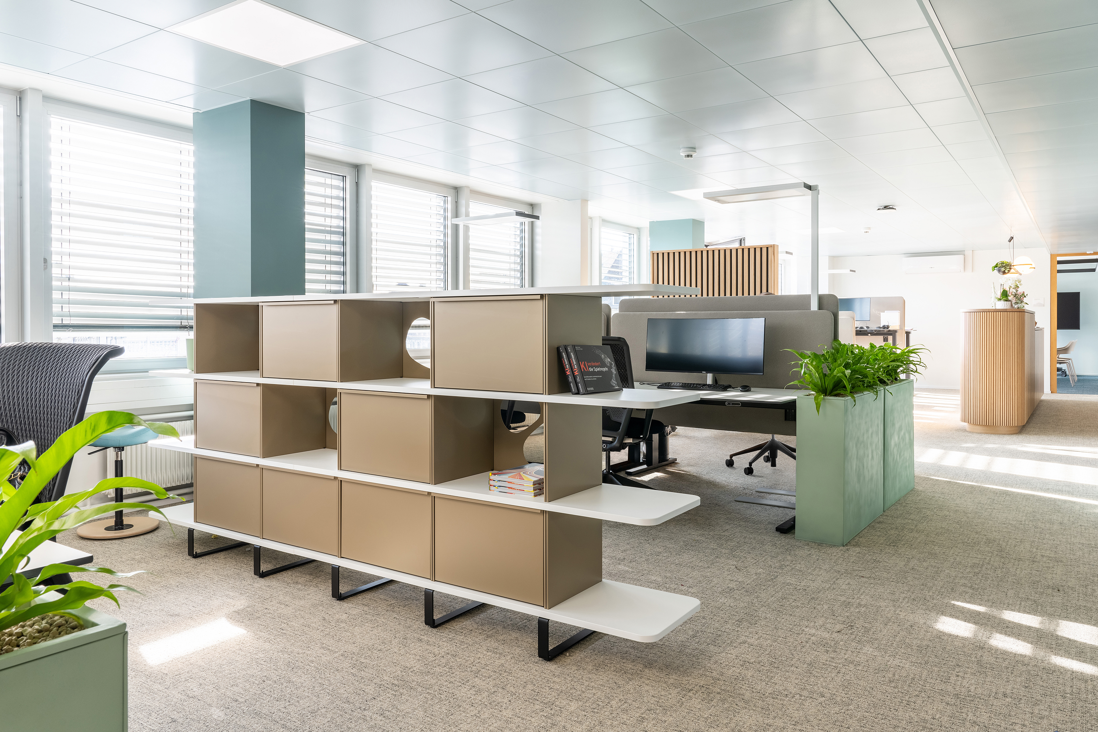 Die diversen Aufenthaltsflächen sind mit Tischen und Stühlen in Stahl-Holz-Optik bestückt. Sie betonen die farblich von der Natur inspirierte und moderne Bürolandschaft zusätzlich. Für den besonderen Wohlfühlcharakter sorgen zahlreiche Grünpflanzen und der neu gestaltete Pausenraum, der mit grossem, komfortablem Sofa behaglich anmutet.