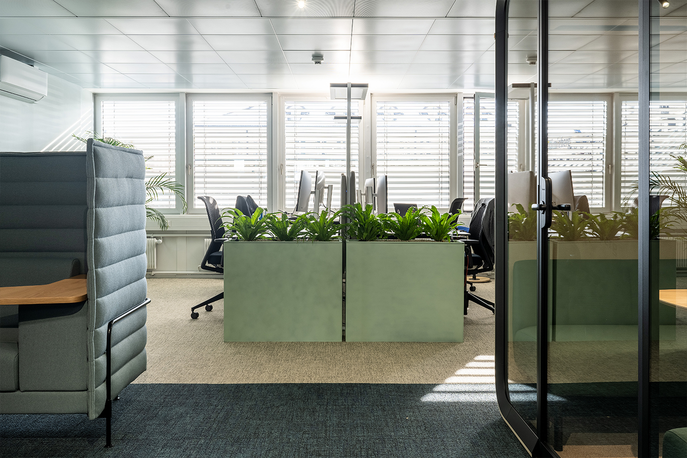 - Zusammen mit den Pflanzen steigern die sanften Grün-, Blau- und Erdtöne das Wohlgefühl im Büro
