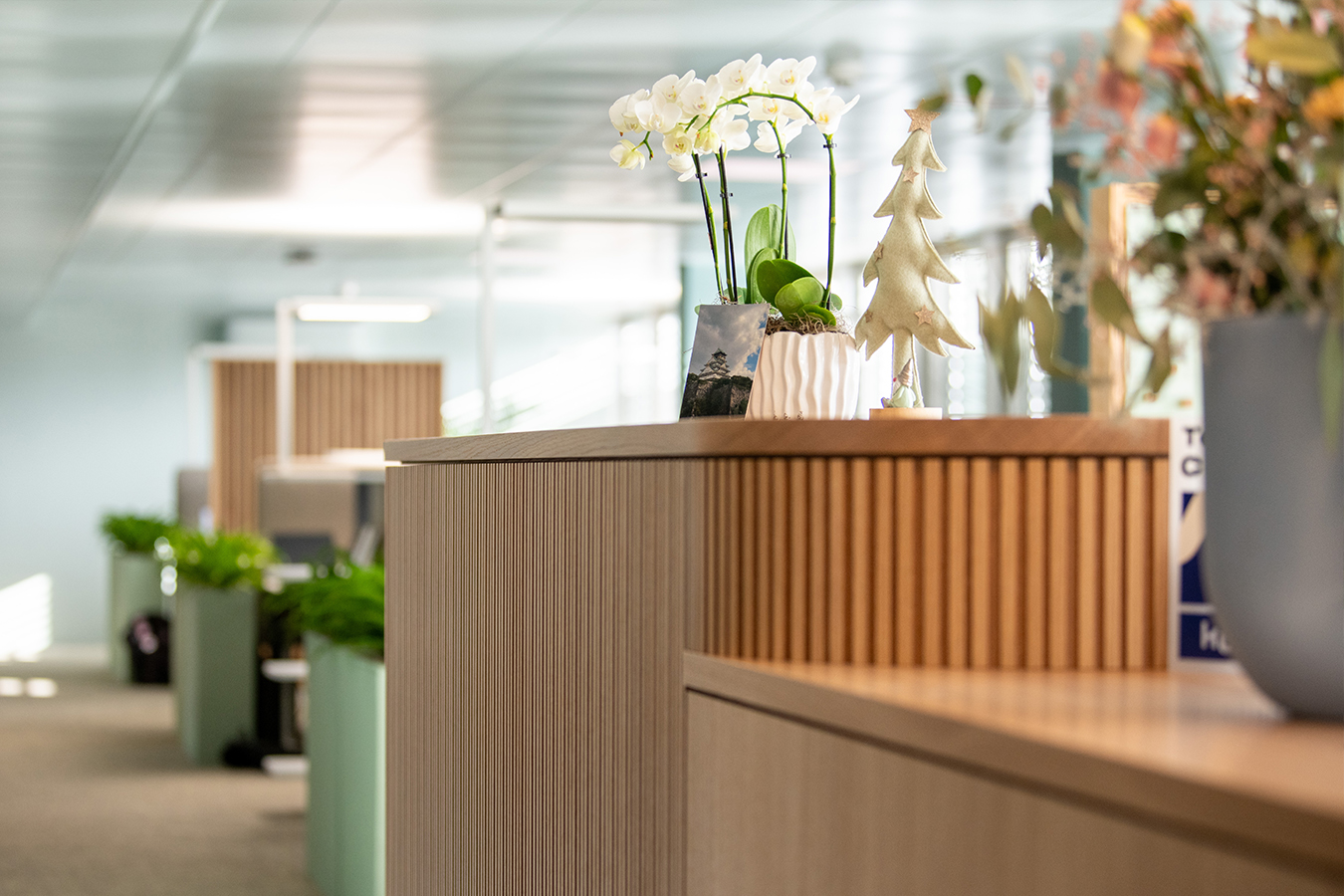 Hochwertige zeitlose Möbel in zurückhaltenden, unaufgeregten Farben und Materialien sowie Pflanzen sorgen für eine ausgeglichene Arbeitsumgebung mit Wohlfühlambiente. Das Büro wird zu einem Ort des Austauschs und zur kreativ-produktiven Oase.