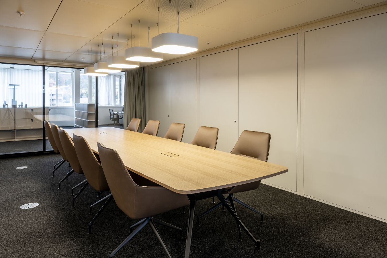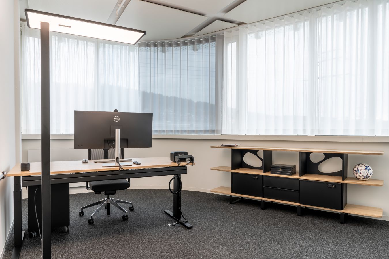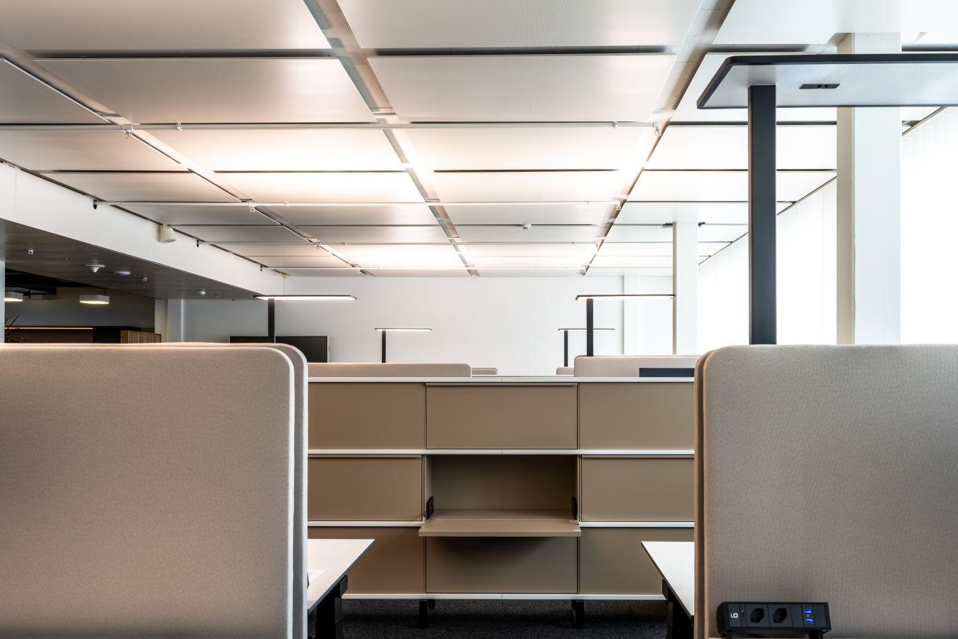 Farben und Materialien fügen sich harmonisch in das bestehende Raumkonzept ein. In allen Zonen herrscht eine wohnlich-einladende Atmosphäre. Die vorhandene Fläche ist optimal genutzt zugunsten effizienter Zusammenarbeit und Prozesse.