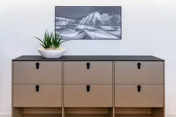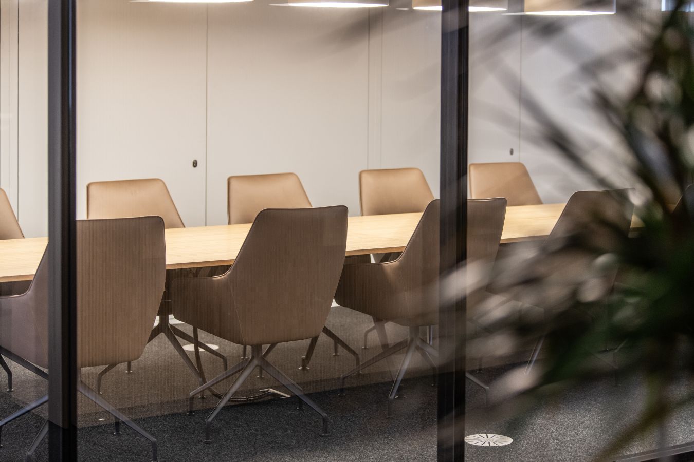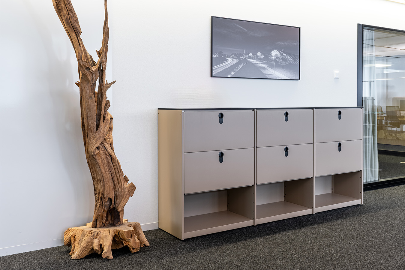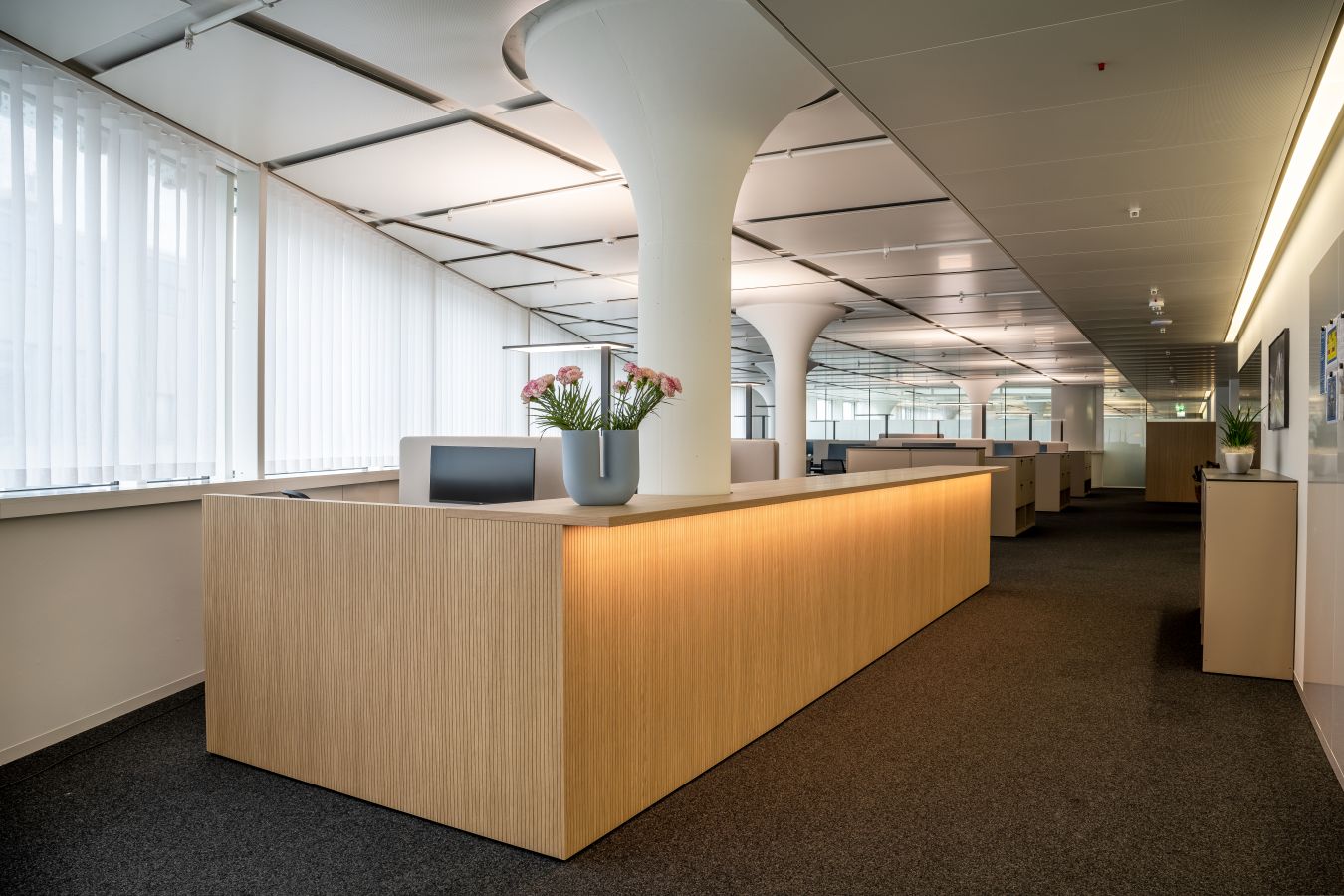 Farben und Materialien fügen sich harmonisch in das bestehende Raumkonzept ein. In allen Zonen herrscht eine wohnlich-einladende Atmosphäre. Die vorhandene Fläche ist optimal genutzt zugunsten effizienter Zusammenarbeit und Prozesse.