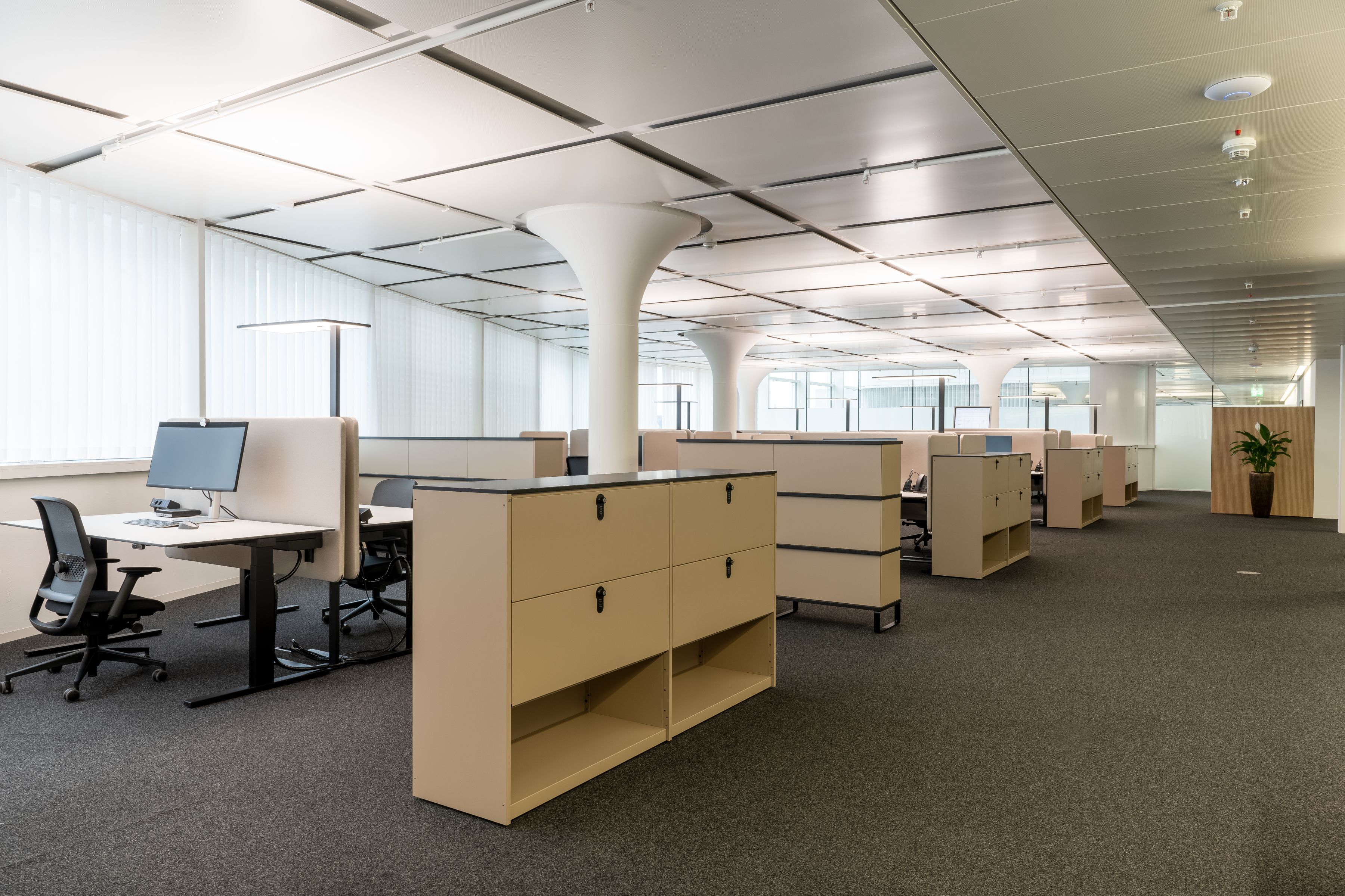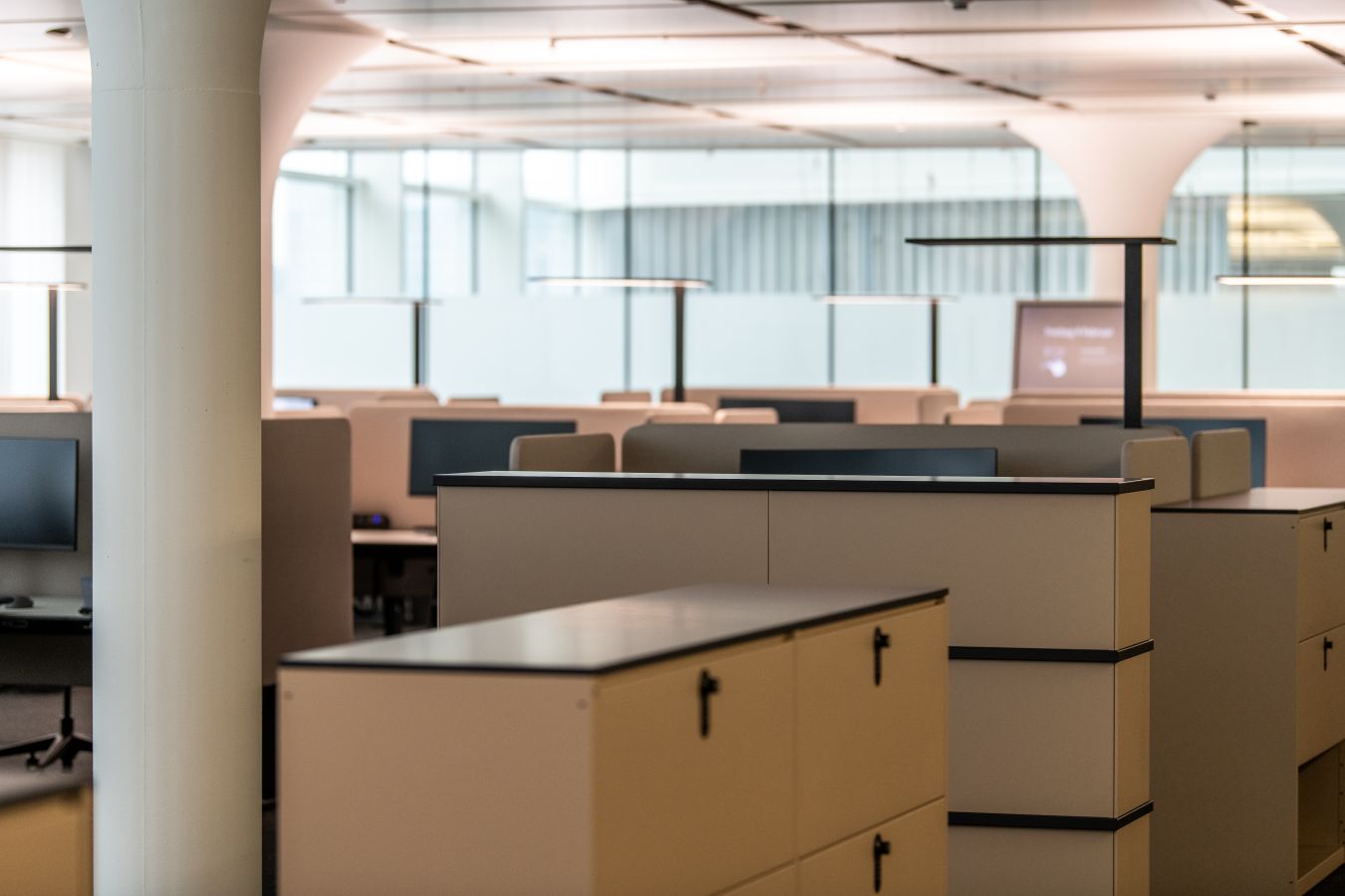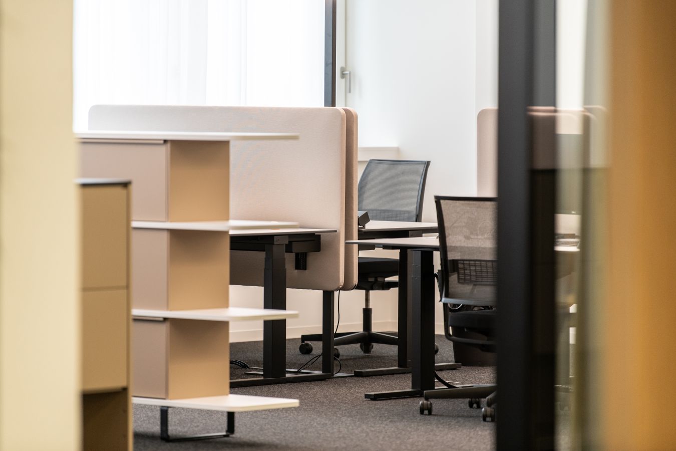 Das Ziel des neuen Bürokonzepts ist, den Austausch unter den Mitarbeitenden zu intensivieren. Die 68 grosszügigen und offenen Arbeitsplätze sind auf zwei Geschosse verteilt. Hellbraune Schliessfächer dominieren die Büroeinrichtung. Auch die Akustiktrennwände zwischen jeweils zwei Arbeitsplätzen treten in freundlichem Hellbraun auf. Die schwarzen Bürodrehstühle wiederum orientieren sich an dem dunklen Teppich und integrieren sich dadurch optisch unauffällig in den Raum. Die Farben in den neuen Büros hat die Simply Services AG bewusst gewählt, um eine angenehme Atmosphäre für Mitarbeitende und Kundschaft zu gestalten.