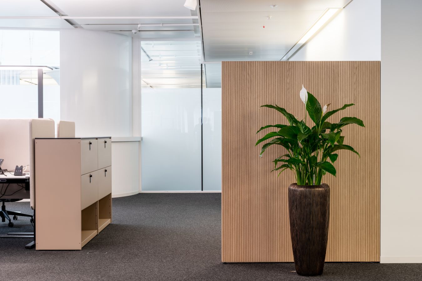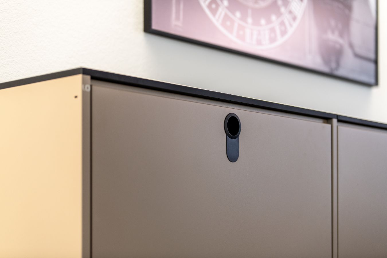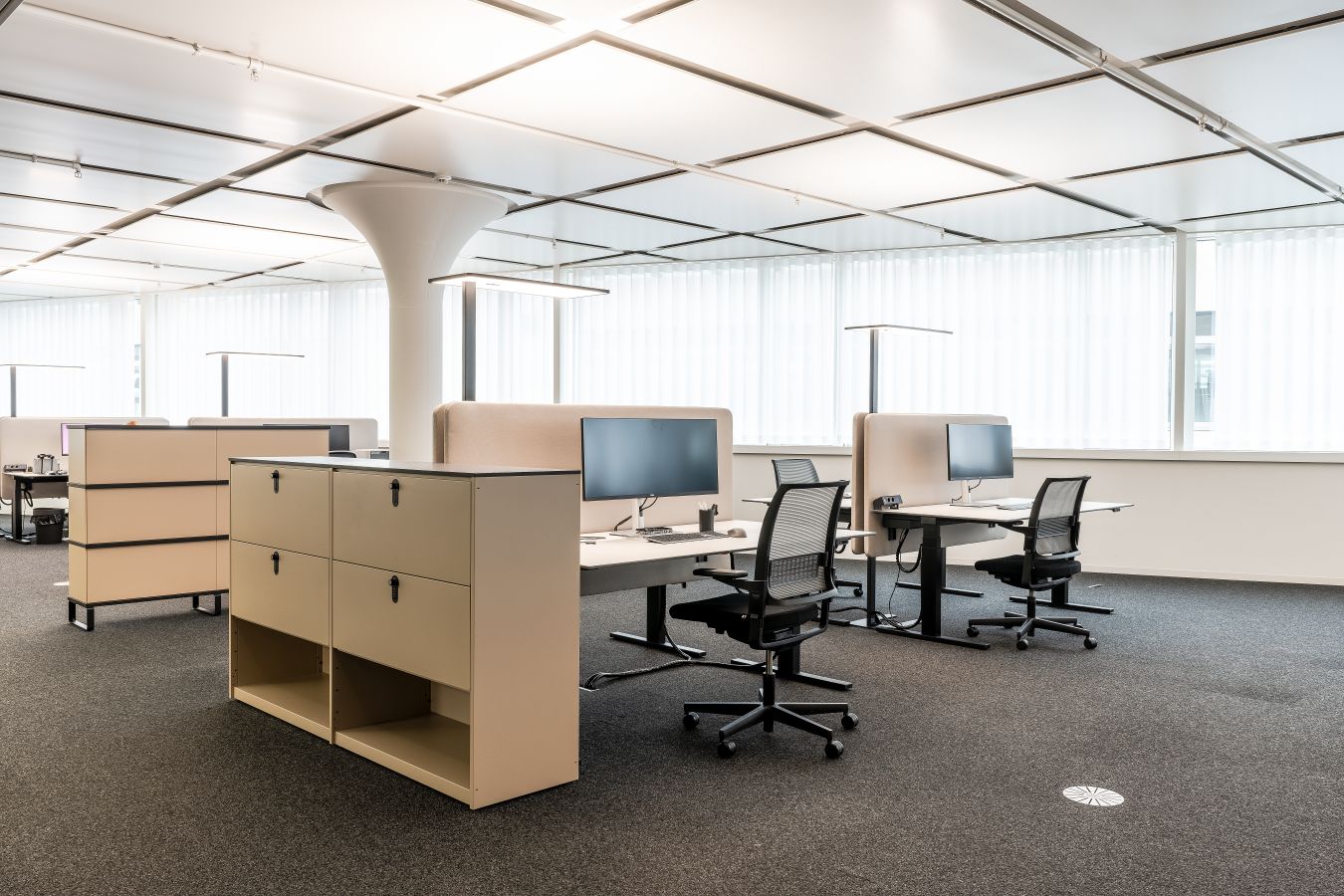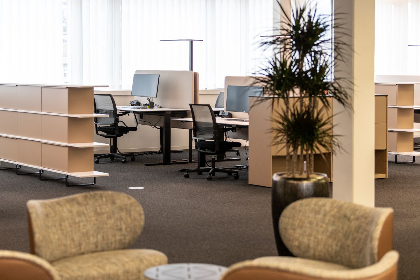 Das Ziel des neuen Bürokonzepts ist, den Austausch unter den Mitarbeitenden zu intensivieren. Die 68 grosszügigen und offenen Arbeitsplätze sind auf zwei Geschosse verteilt. Hellbraune Schliessfächer dominieren die Büroeinrichtung. Auch die Akustiktrennwände zwischen jeweils zwei Arbeitsplätzen treten in freundlichem Hellbraun auf. Die schwarzen Bürodrehstühle wiederum orientieren sich an dem dunklen Teppich und integrieren sich dadurch optisch unauffällig in den Raum. Die Farben in den neuen Büros hat die Simply Services AG bewusst gewählt, um eine angenehme Atmosphäre für Mitarbeitende und Kundschaft zu gestalten.