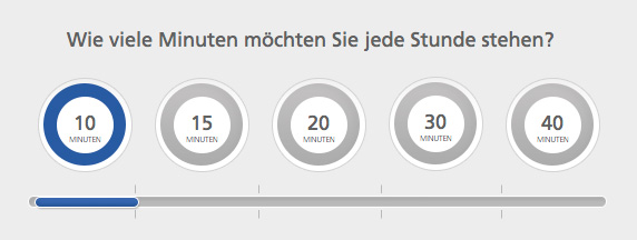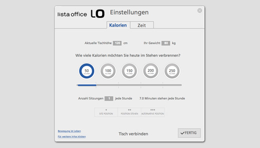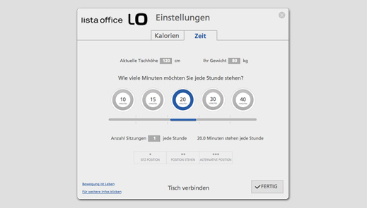 Was bringt der beste Sitz-/Stehtisch, wenn man ihn nicht bewegt? Mit der LO Move-App, die Sie exklusiv von Lista Office LO erhalten, kann das nicht passieren. Das Prinzip ist so einfach wie wirksam: Sie legen Ihre täglichen Bewegunsgziele fest, und die App schickt Ihnen eine Erinnerung auf den Computer-Bildschirm, sobald Sie die Tischhöhe wechseln sollten.