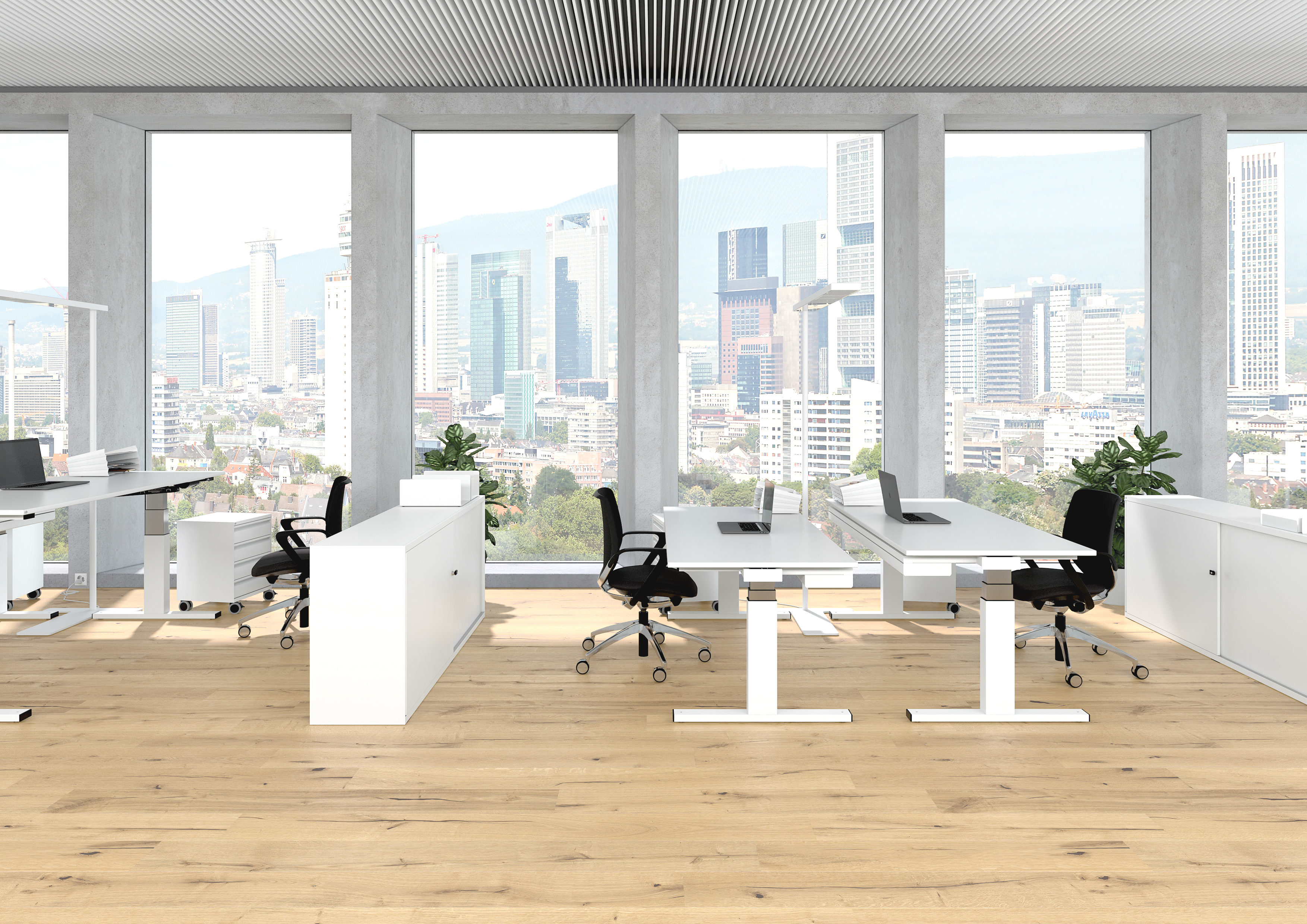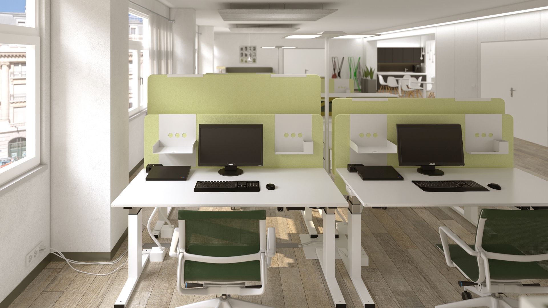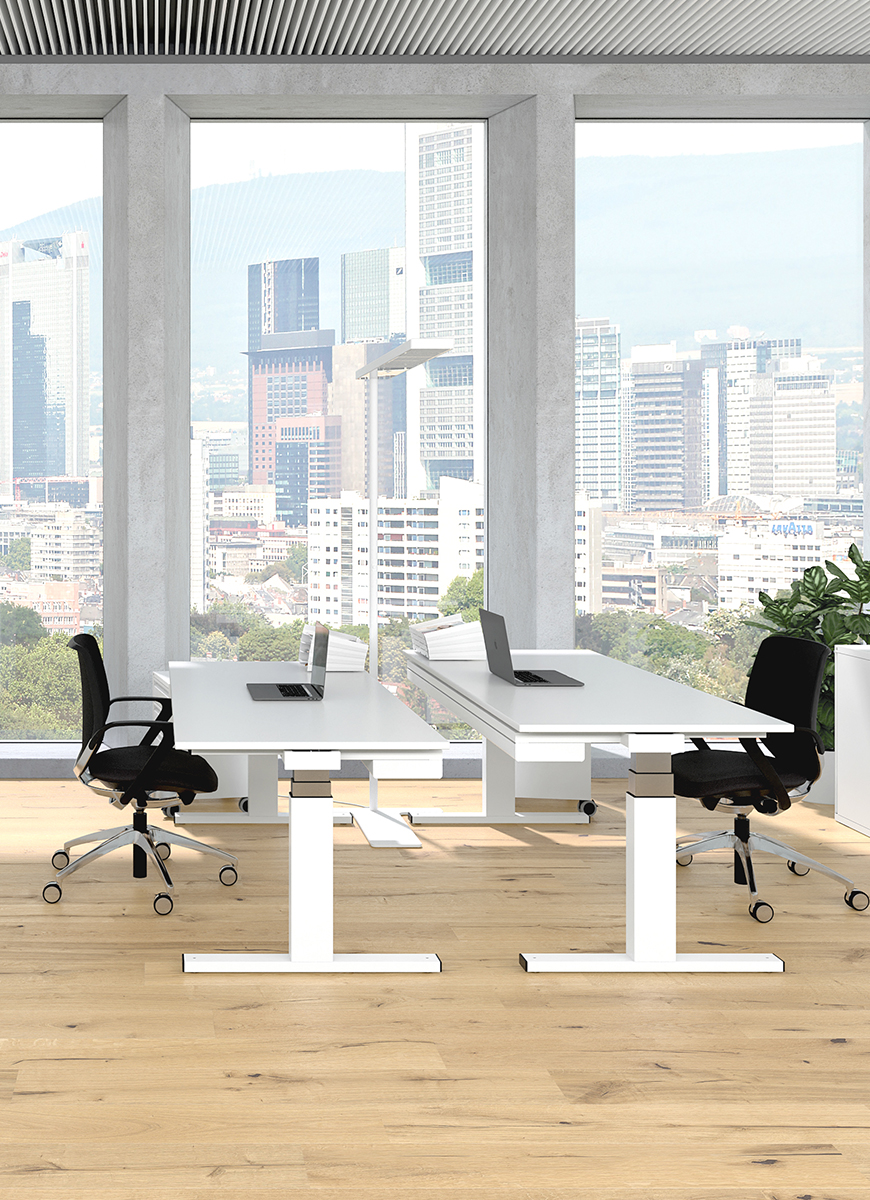 Selbst modernste und nachhaltigste Büromöbel entfalten ihre volle Wirkung nur, wenn der Arbeitsplatz maximale Konzentration zulässt. Zwei akustisch wirksame Schutzwände und passende Organisationselemente fördern effizientes und konzentriertes Arbeiten.