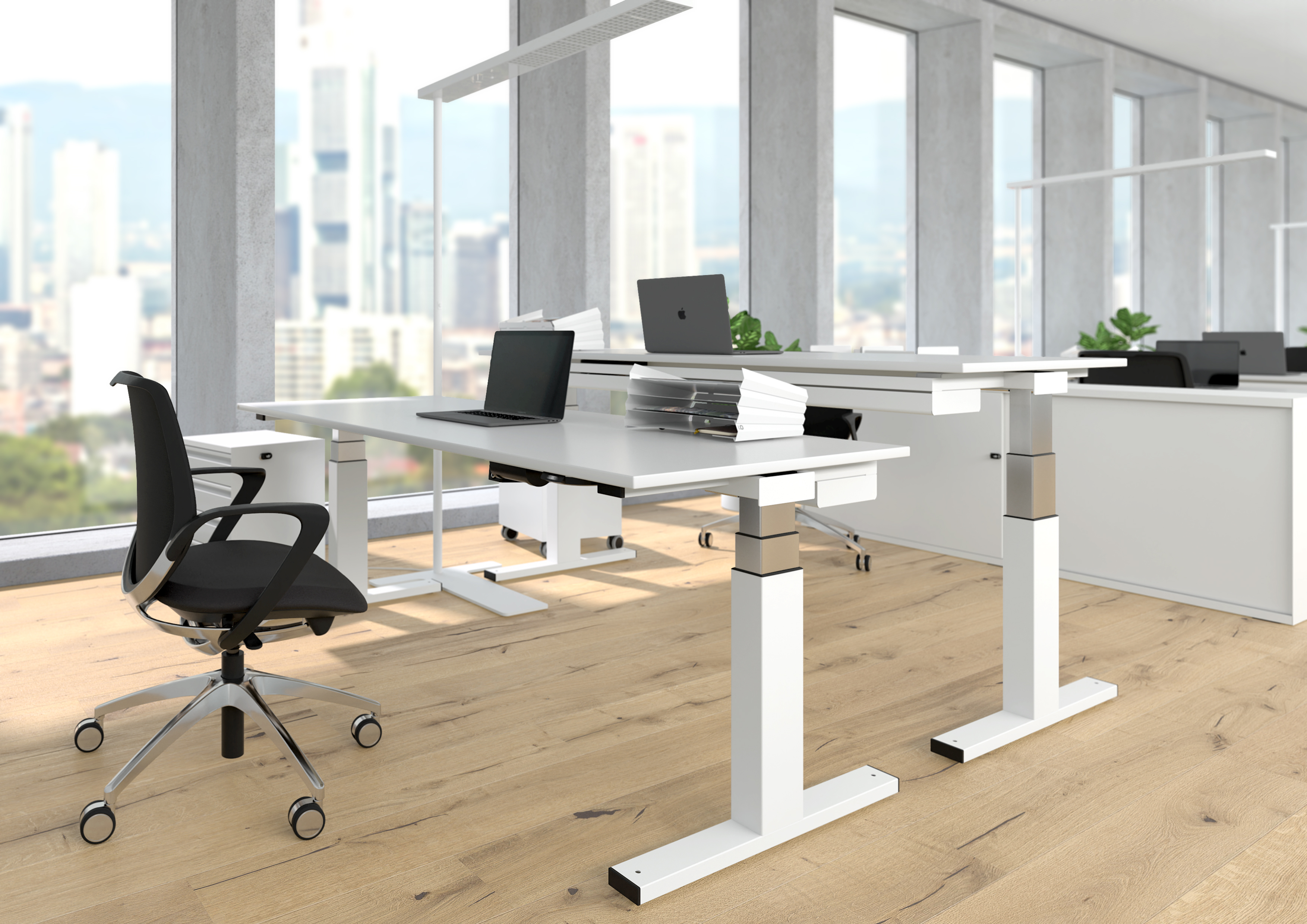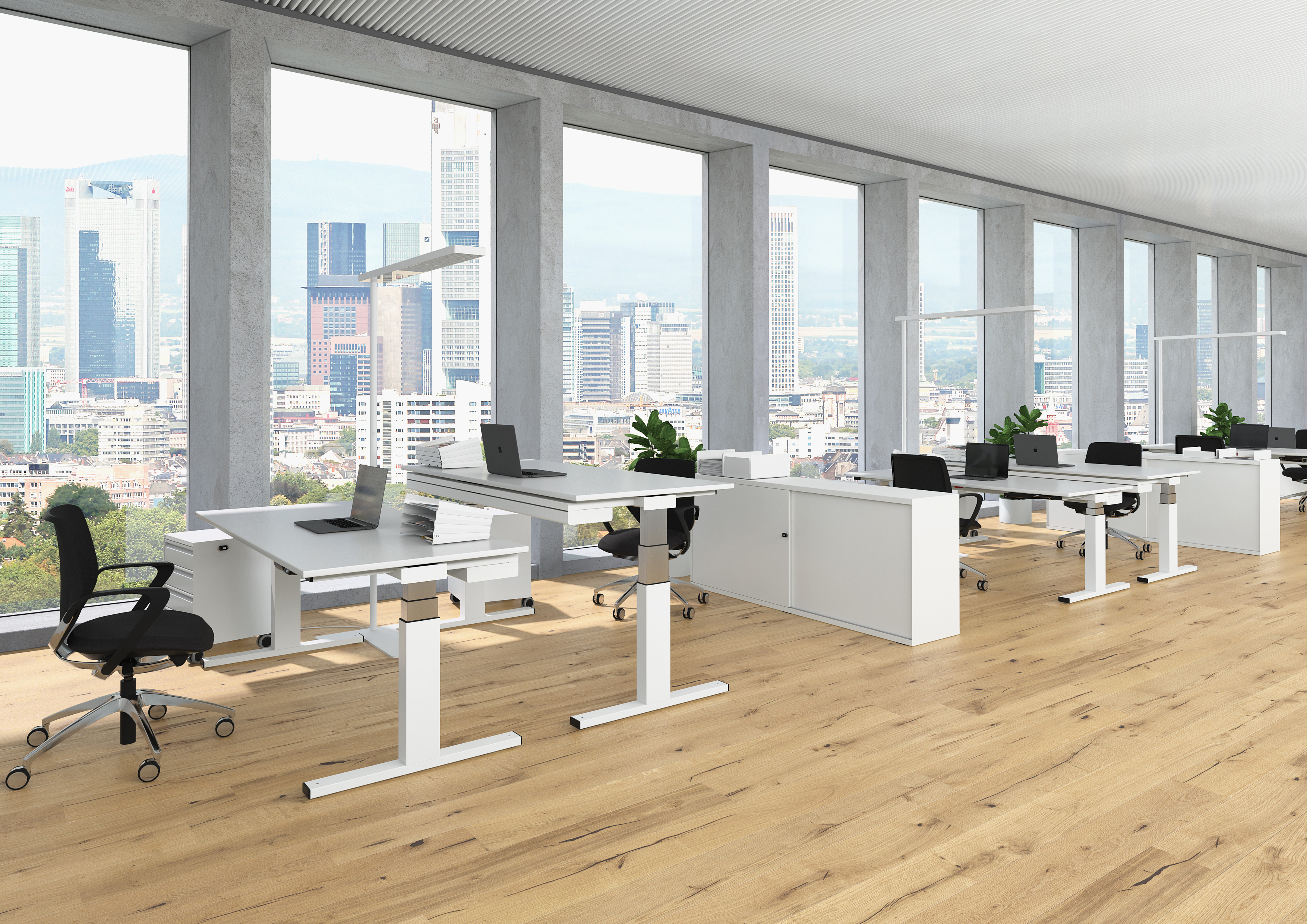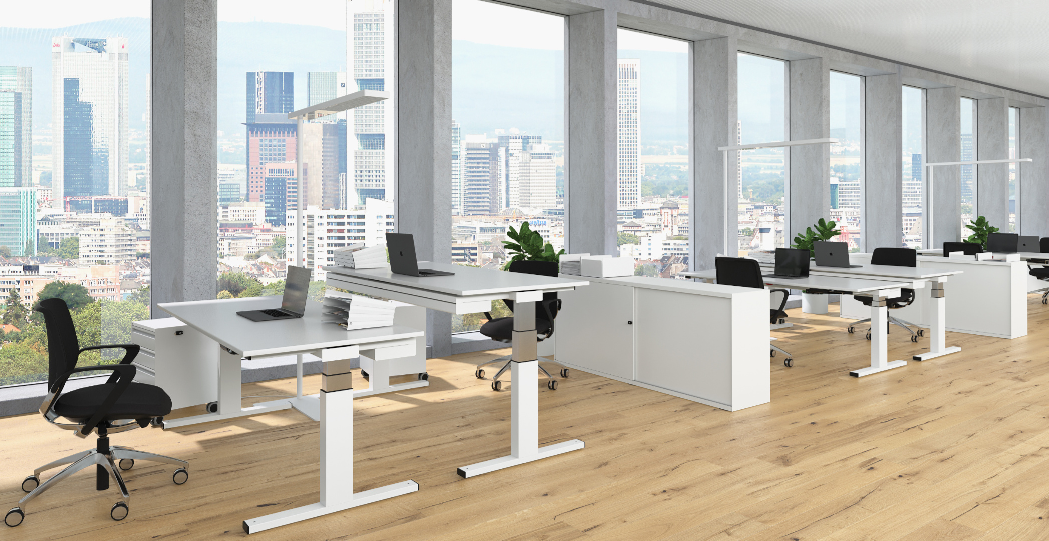 Selbst modernste und nachhaltigste Büromöbel entfalten ihre volle Wirkung nur, wenn der Arbeitsplatz maximale Konzentration zulässt. Zwei akustisch wirksame Schutzwände und passende Organisationselemente fördern effizientes und konzentriertes Arbeiten.