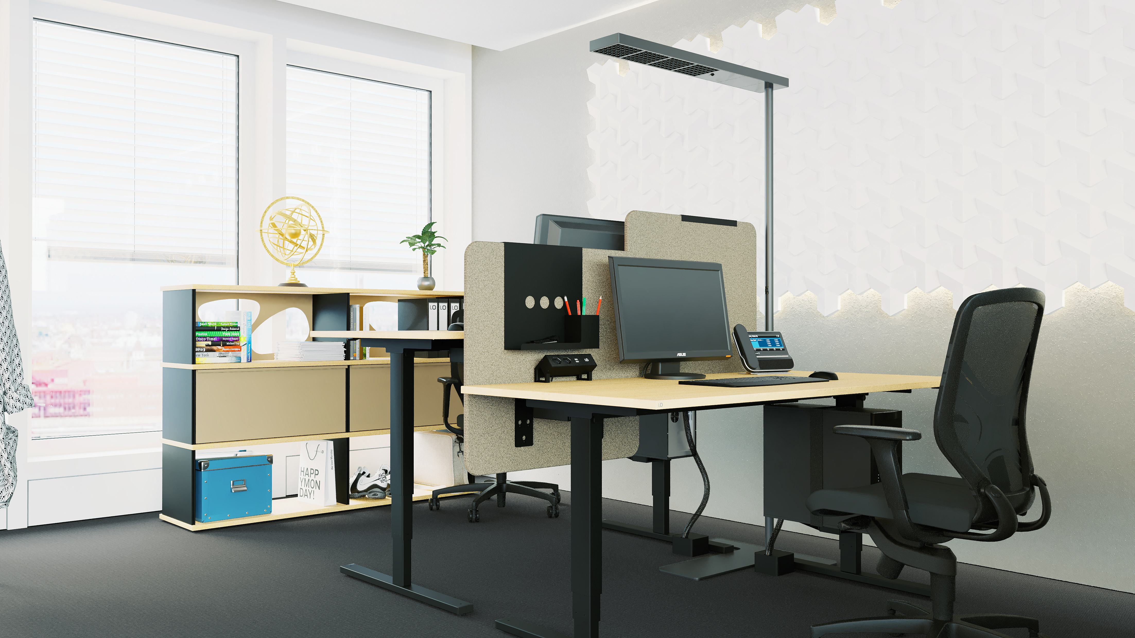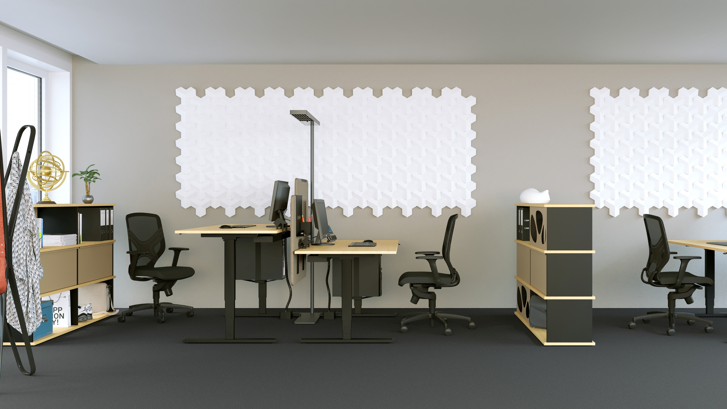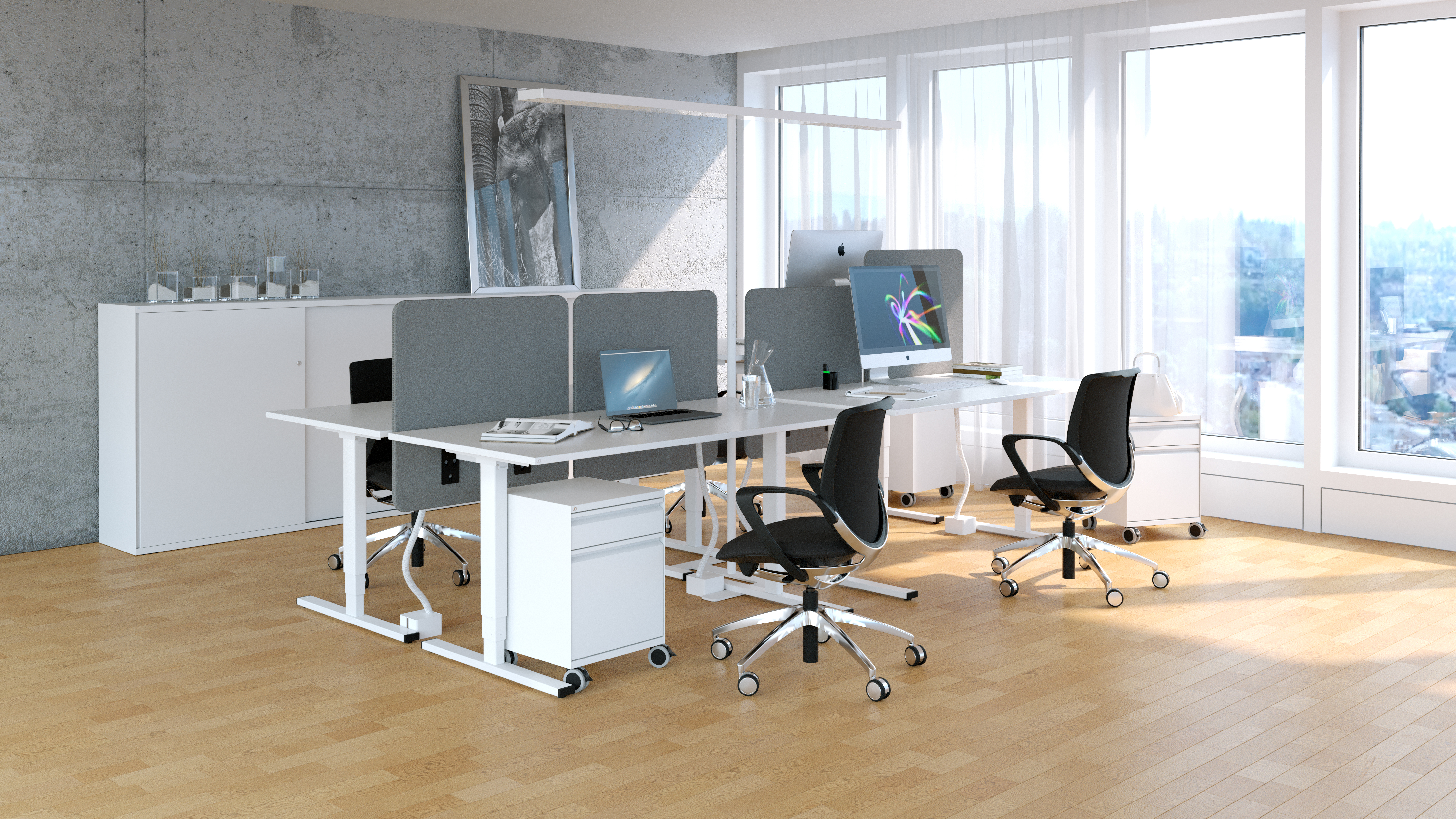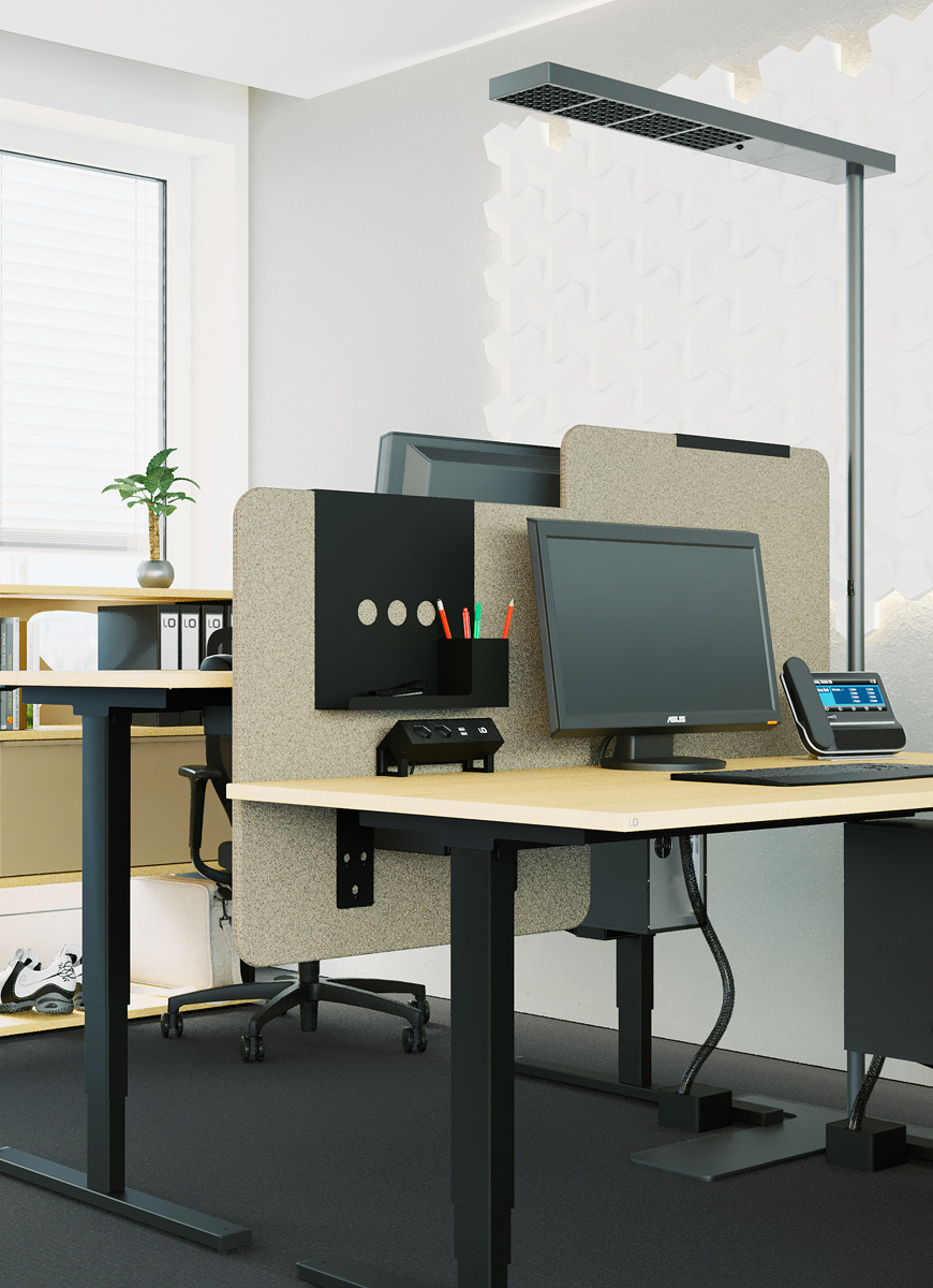 Ohne Ruhe keine Konzentration. Ohne System keine Ordnung. Drei akustisch wirksame Sichtschutzwände mit einer Vielzahl von passenden Organisationselementen sorgen für mehr Privatsphäre und Individualität am Arbeitsplatz.