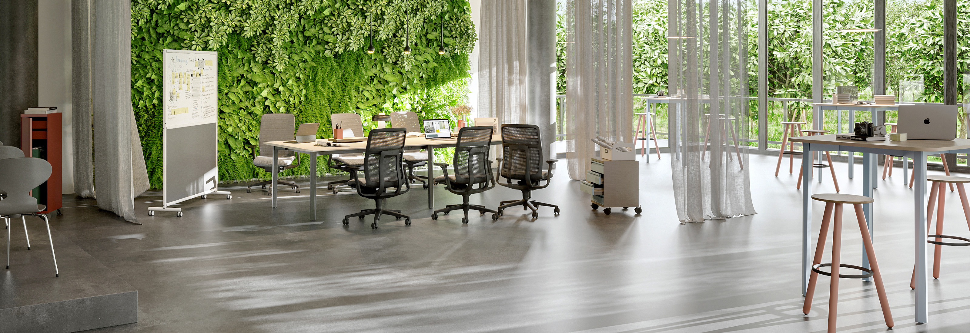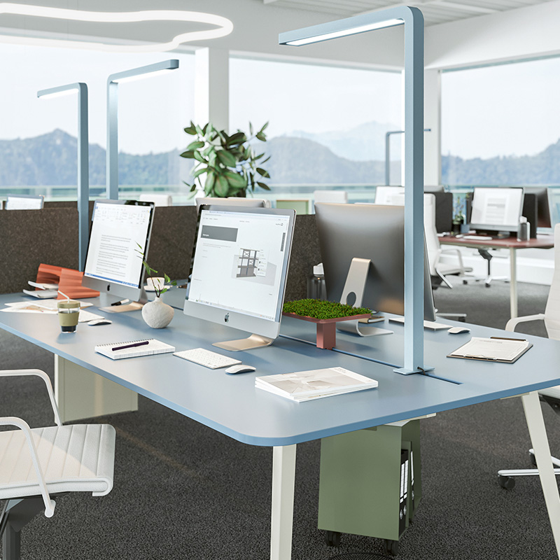 Antworten auf komplexe Anforderungen bietet der LO Summit T. Mit schallabsorbierenden Trennwänden aus Filz, die sich mit einem Handgriff montieren oder demontieren lassen, wird ein Gruppentisch mühelos in Einzel-, Team- oder Projektarbeitsplätze umgewandelt und optimiert so das Nutzungsspektrum und die Flächennutzung.