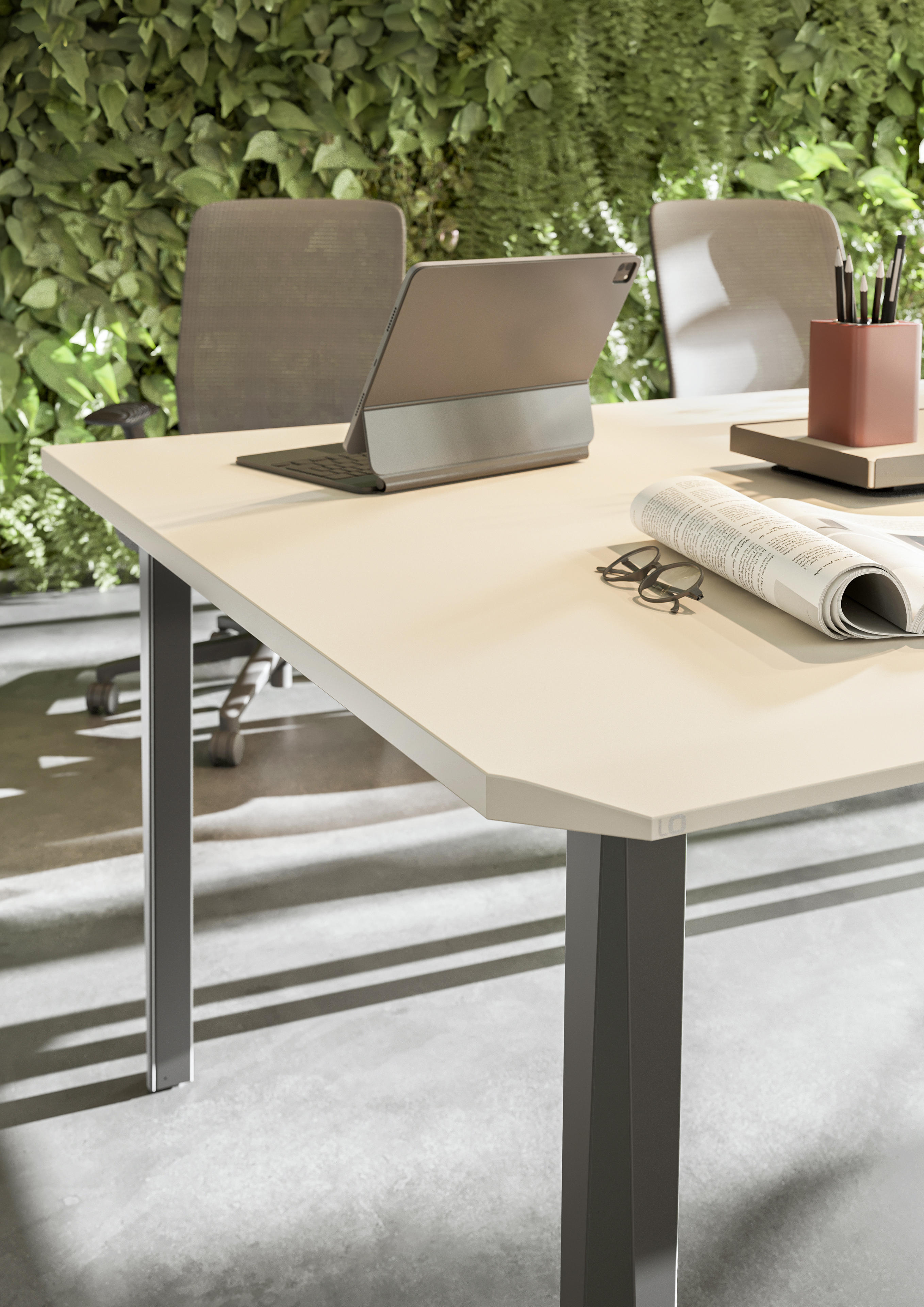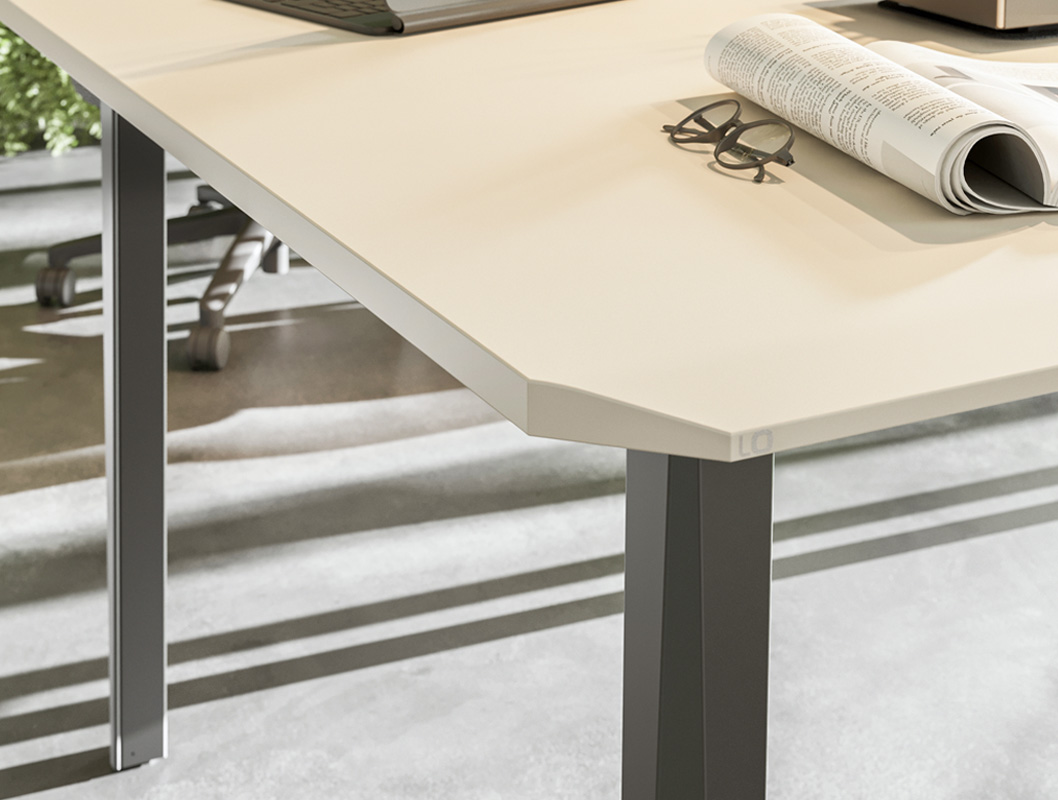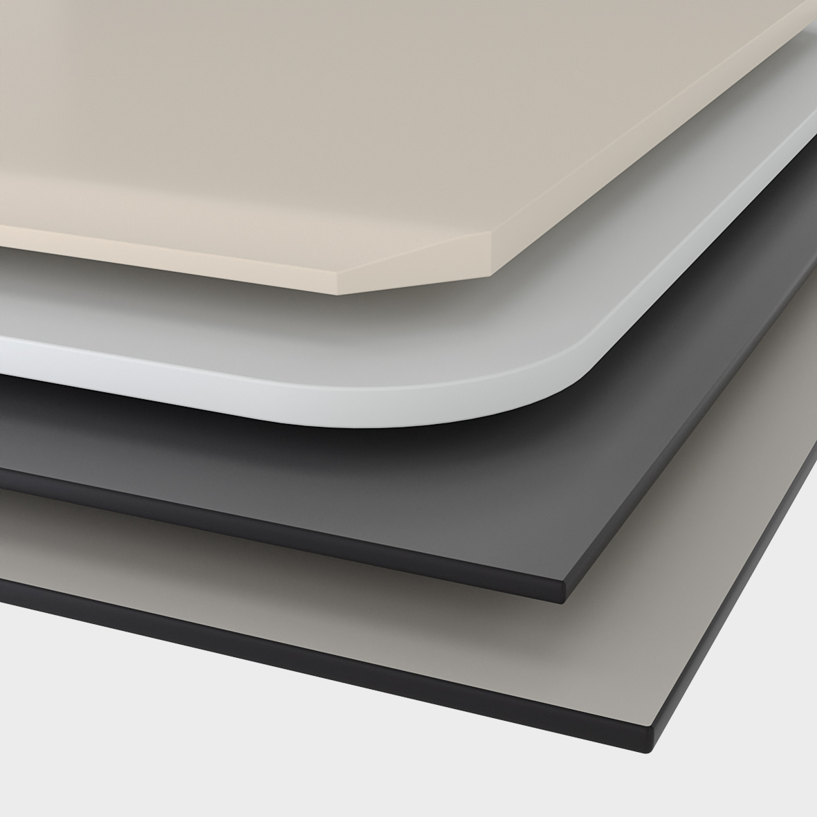 Neben einer breiten Palette von Tischplattenstärken und Kantenbildern präsentieren wir neu die ergonomische MDF-Platte mit abgeschrägtem Kantenprofil.