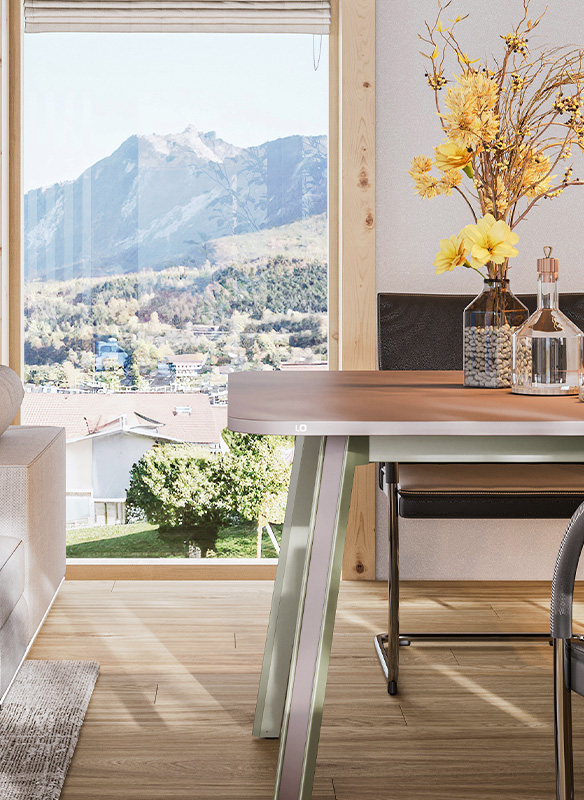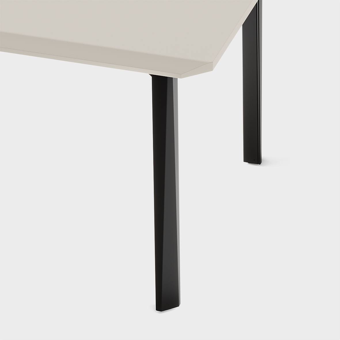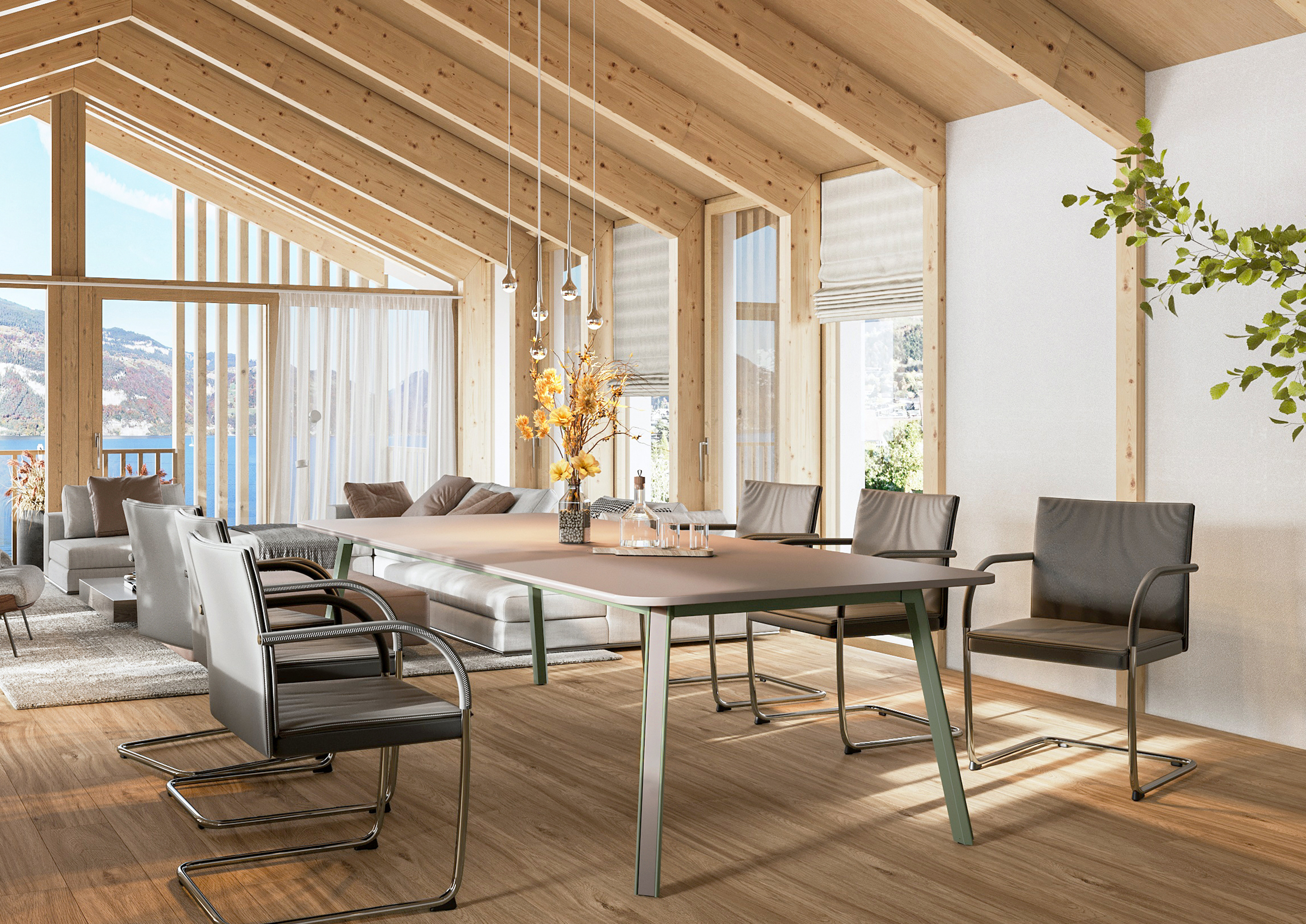 Nahtlose Harmonie durch den Tischfuss mit Inlay in der Tischplattenfarbe.