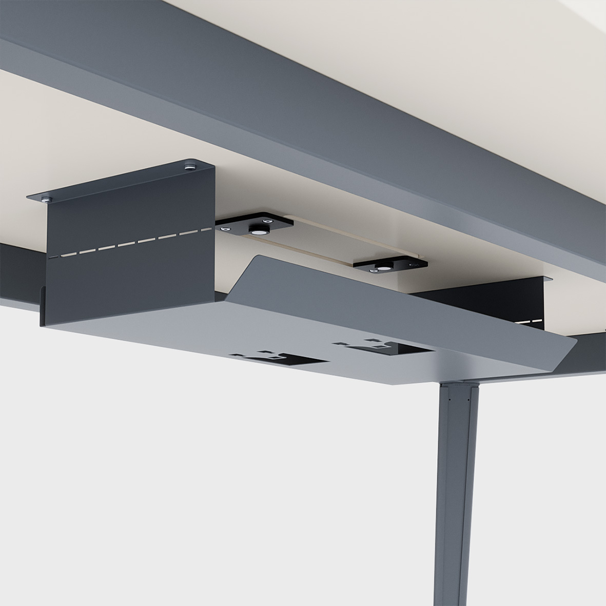 Der Kabelkanal ist direkt an die Tischplatte geschraubt und in zwei Höhen einstellbar.