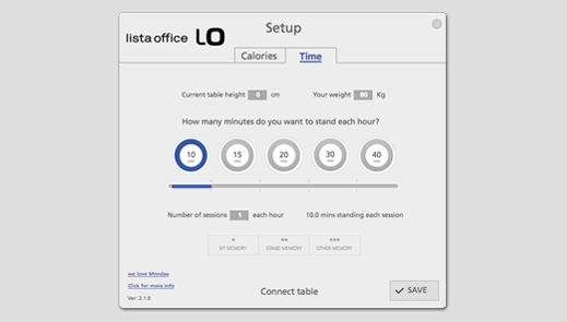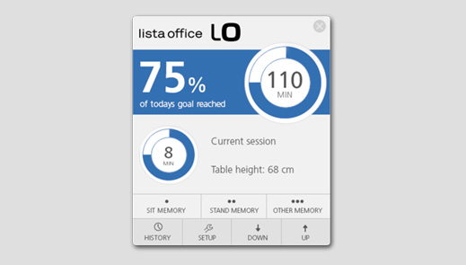What's the point of having the optimum sitting/standing table if you don't move it? With the LO Move-App, available exclusive from Lista Office LO, that won't happen. The principle is simple but effective: you define your daily movement targets, and the app displays a reminder on the computer screen to let you know when you need to switch the table height.