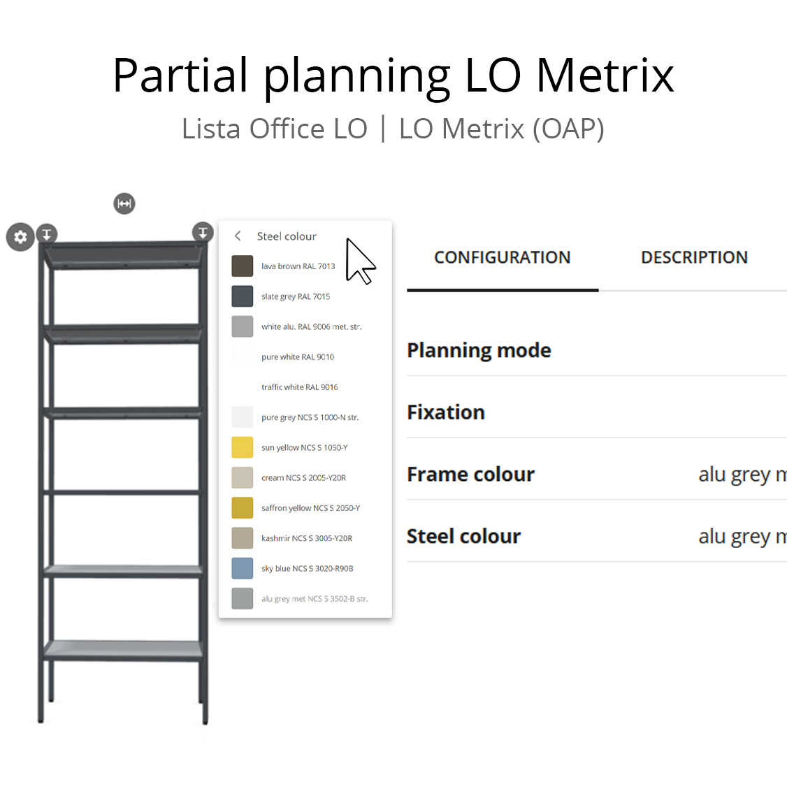 The LO Metrix system has been carefully designed to be adaptable to changing requirements: panels, accessories, and partitions can be moved around or swapped out with no need for tools. Even the unit itself can be rebuilt quickly and easily to adapt to new requirements and layouts. Thus the shelving remains timelessly flexible and ready for every new challenge.