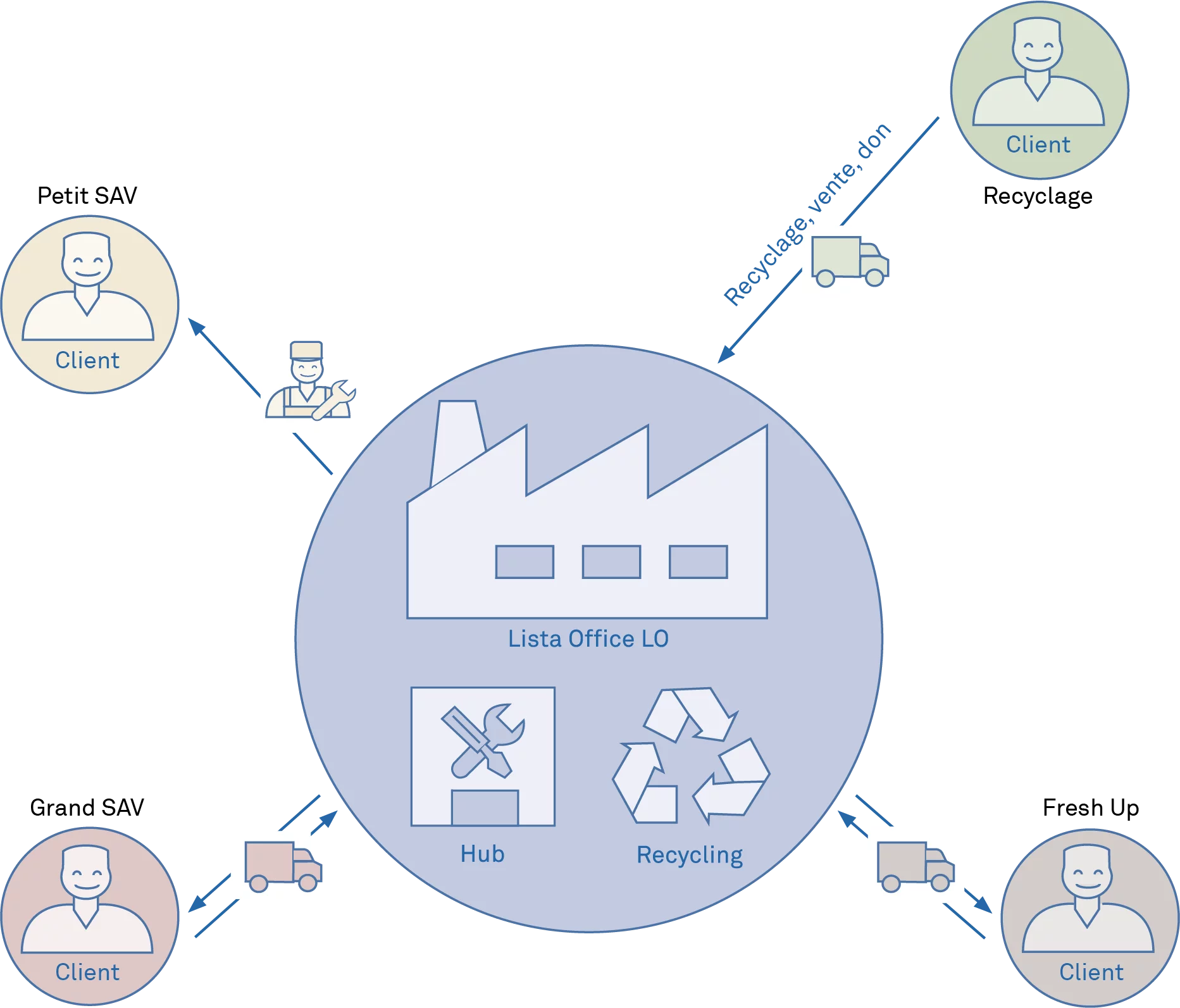 Nous enlevons les meubles qui sont ensuite démontés, triés en fonction des matériaux et recyclés. Les meubles utilisables sont vendus par Lista Office LO ou donnés.
