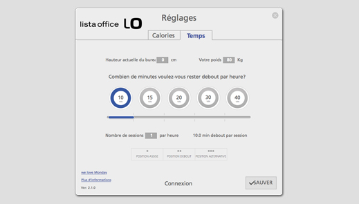 À quoi vous sert la meilleure table de travail assis/debout si c'est pour toujours travailler dans la même position? Avec la LO Move-App, disponible en exclusivité auprès de Lista Office LO, aucun risque que cela arrive. Le principe est aussi simple qu'efficace: vous fixez vos objectifs quotidiens en termes de mouvement et l'appli vous envoie un rappel sur l'écran de l'ordinateur dès qu'il est temps de changer la hauteur de table.